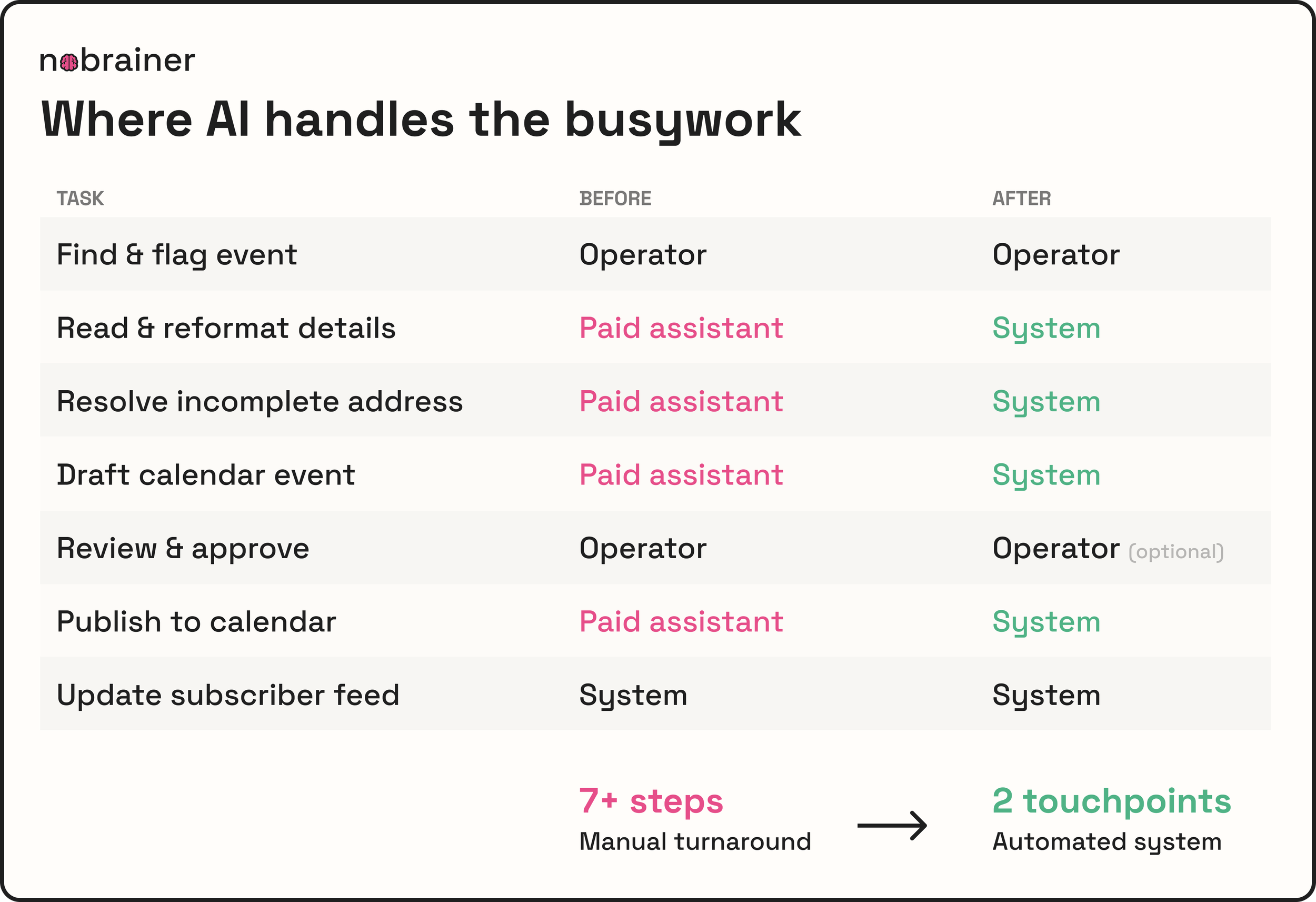 We designed a system that automatically receives, reformats, and routes event submissions for approval and publication — all from two simple triggers: a flagged email or a URL dropped in Slack. An AI layer reads the source, extracts the relevant details, and formats them into a clean draft. If a location address is missing, an automatic map lookup resolves the full location. The draft lands in a central approval sheet and the operator gets a Slack notification that it’s ready to review. When the operator marks the event Approved, the event automatically publishes to the calendar and subscriber feed without any additional steps.